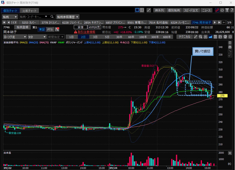 ・岡本硝子、S高がはがれたのを見て、再度S高に向かくことを期待して買いエントリ。が。。。若干の反発はあったものの下げ傾向。。一気に上げそうな場面はあったものの結局引け間際に底値近辺にて損切慣行。(マイナス5000円程度)