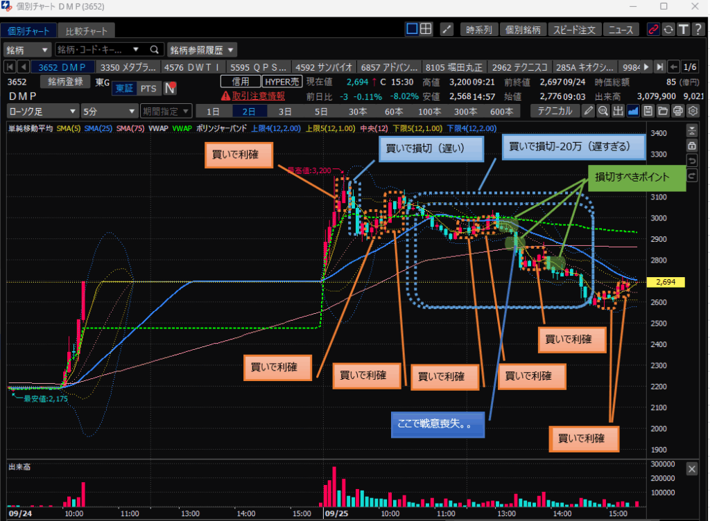 ・DMP、前場持ち越し分(含み損)抱えつつ後場開始。後場開始から上げ基調だったので追加で買いエントリし即利確。が。ホールド買い建ての価格までは届かず継続ホールド。。13時ごろ上げからの下げ、、からの底値停滞が15分ほど経過。(さがそうな気配だったので、ここで損切するのが正解でした)が、13時20分ごろに第一弾の急落。。<ここでメンタル崩壊、、、戦意喪失状態に陥りました。。。