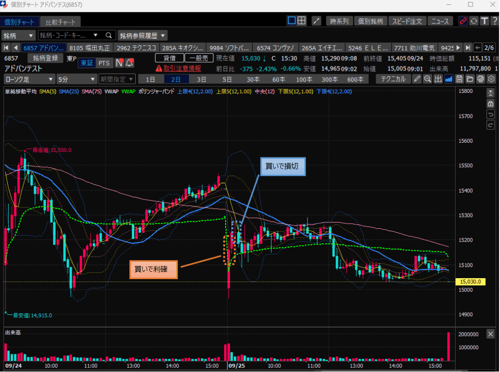 ・アドバンテスト、買いエントリし利確。その後買いで入りつ続けるも下げるので損切(TOTALプラマイゼロ。。。)