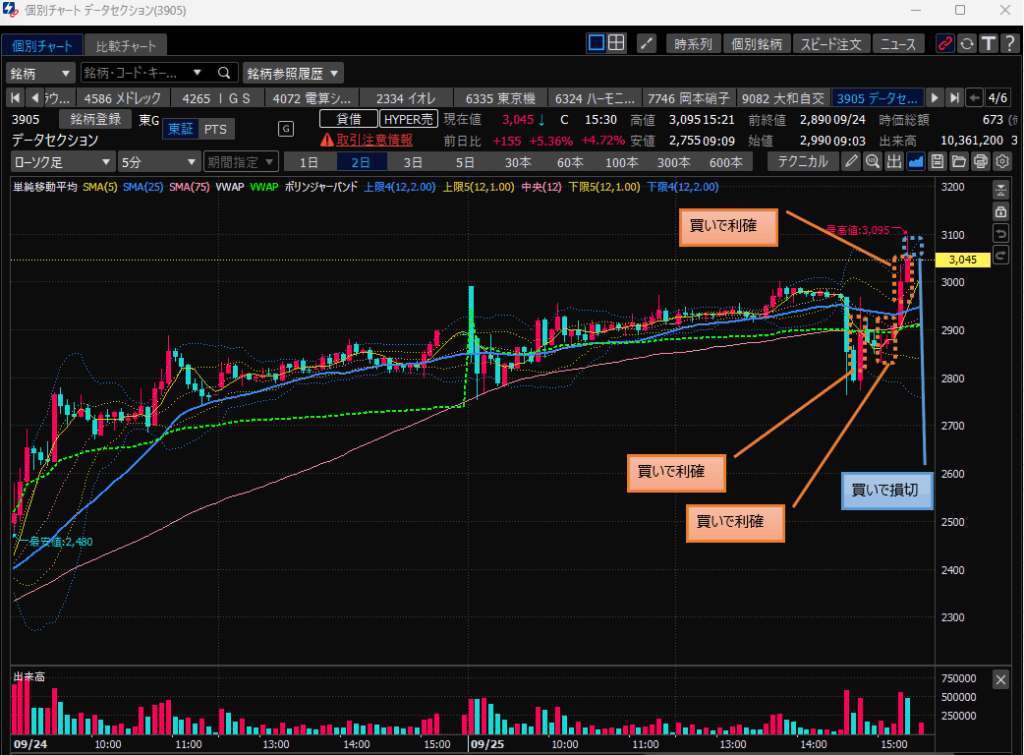 グロースでは、前日S高銘柄でも後場に下げ散らかすこともある。高値圏でのエントリは損切ポイントを明確にしたうえで入ること。。そして、下げそうであれば即損切を慣行すること。。