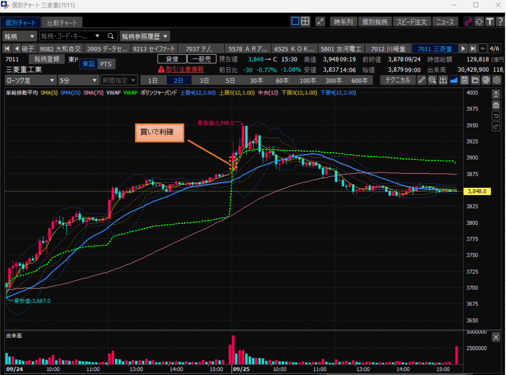 ・寄りから、三菱重工で買いエントリ、利確(微益)