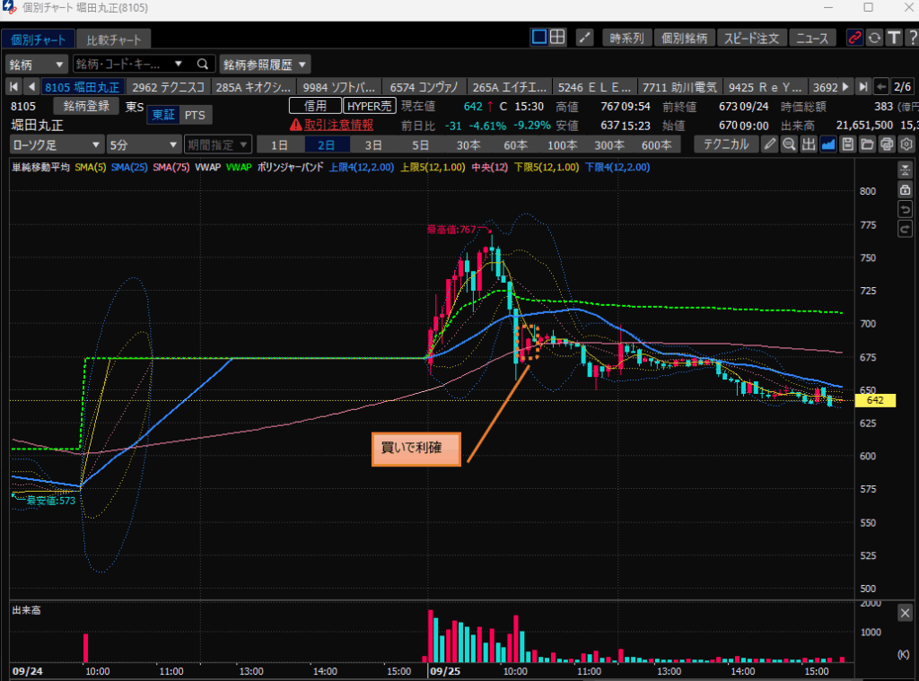 ・堀田丸正、10時過ぎに下げからのリバウンドにて買いエントリし利確(微益)。
