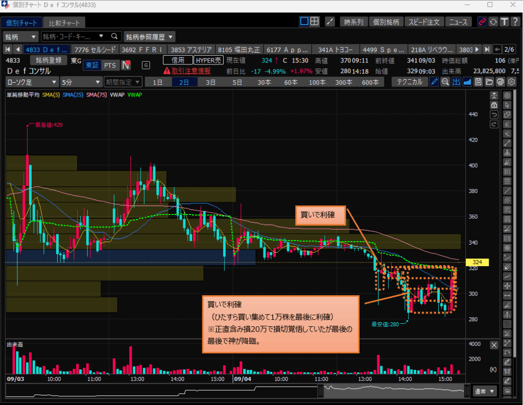 ・Defコンサル、弱そうでしたが急落があったので底値近辺で買いエントリ。すぐにリバって利確。その後も買い集めして10000株まで、、、ただ上げ切らない、下げ方向。。。これも損切かぁと思いきや、最後の最後で神降臨。。。。数十万株を買いあがってくれたので、私の1万株も利確できました。(買い集めたものの上がりきらずに一時は20万くらいの含み損がありましたが、プラスで回収)