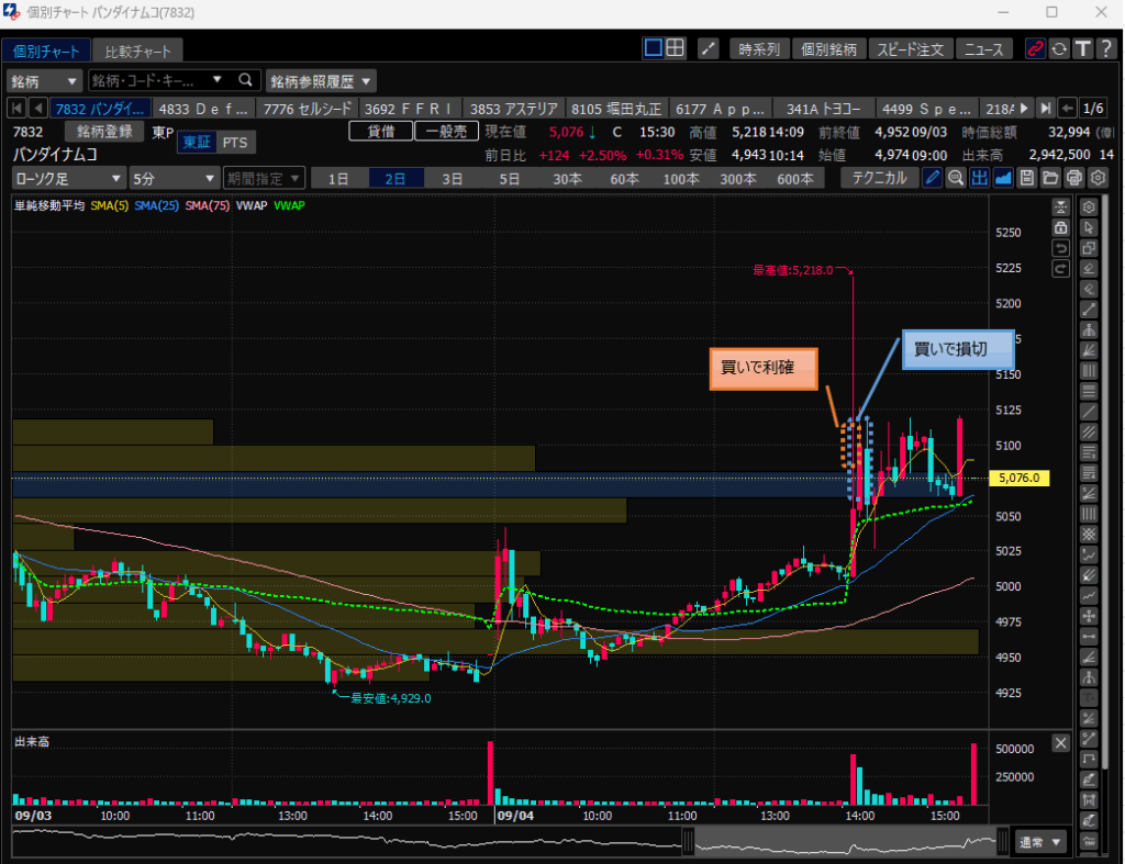・バンダイナムコが急騰(何があったのかはわかりませんww)。一応買いでエントリ、一度利確できたのですが、2回目は下げをくらって損切(この類の急騰でうまく取れたためしがない、、、)