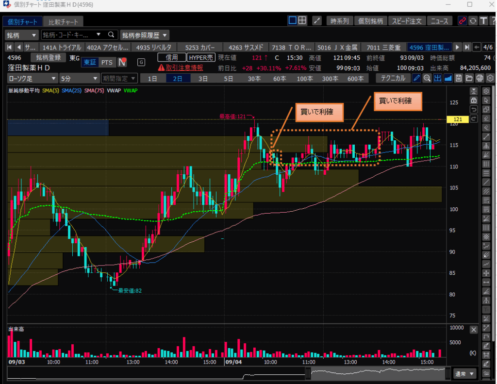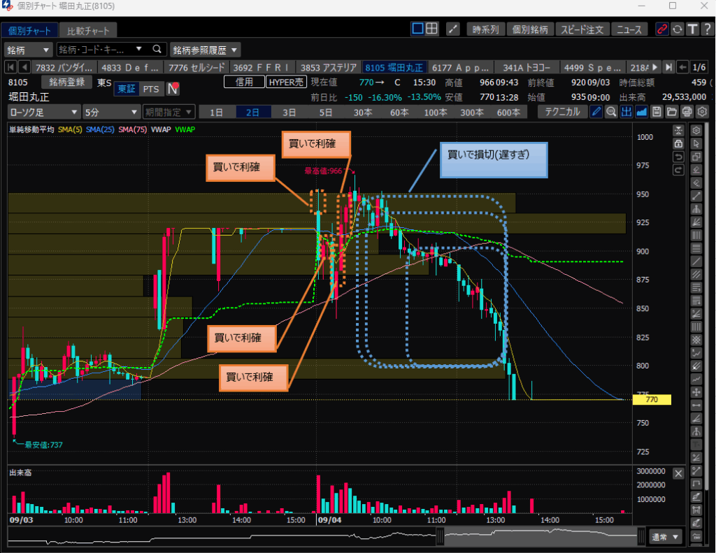 ・寄り付きから堀田丸正にエントリ、微益ではあるもの買いで利確。その後も上昇したので買いで利確をそこそこ。
