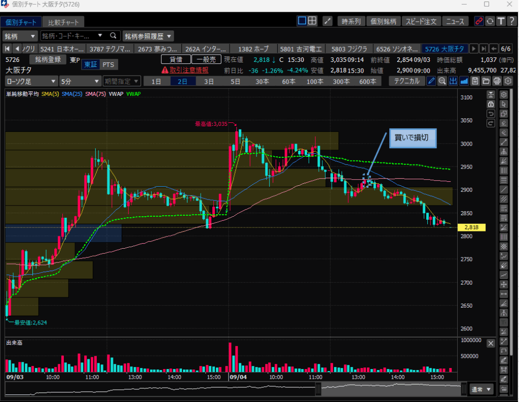 ・損切して資金枠空いたので新規一片取返し。まずは大阪チタ、エントリするも上げそうにないので即損切。